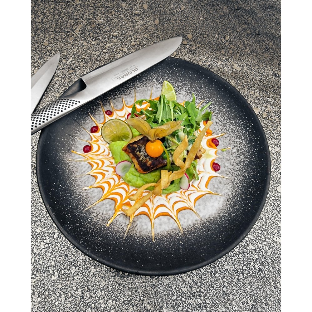 Il Global G‑46 Santoku 18 cm è un coltello universale perfetto per il taglio quotidiano: affetta, trita e sminuzza verdure, carne magra e pesce con precisione. Lama da 18 cm in acciaio CROMOVA‑18 (temp. Rockwell 56‑58), lunghezza totale circa 30 cm, peso intorno a 170 g. Manico seamless bilanciato, filo acuto a 15° per prestazioni superiori. Lavare a mano per preservare filo e finitura.