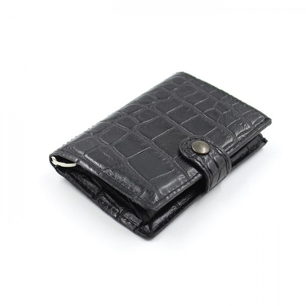 Il Croco Blk iClutch + Coins è un portafoglio elegante e compatto, realizzato in pelle nera con texture a coccodrillo. Con dimensioni di 9 x 6,5 x 1,5 cm, offre due scomparti per carte (fino a 5-6 carte ciascuno) e una tasca per monete, unendo praticità e stile. La pelle di alta qualità migliora nel tempo, garantendo durabilità. Il design sofisticato e il packaging raffinato lo rendono una scelta ideale anche come regalo, combinando artigianato italiano e design minimalista nordico.