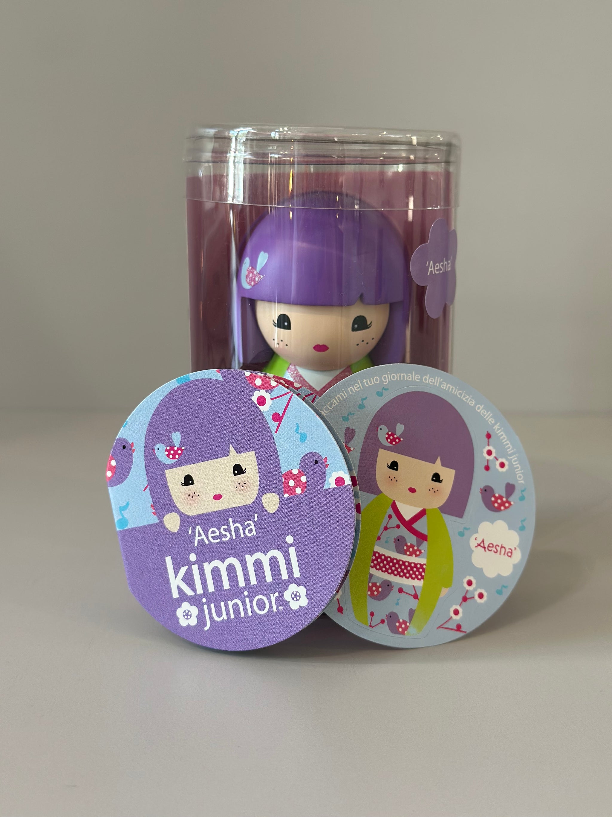 La Kimmi Junior “Aesha” è una tenera bambola da collezione ispirata alle bambole giapponesi kokeshi, pensata per trasmettere un messaggio positivo di armonia, gentilezza e gioia.