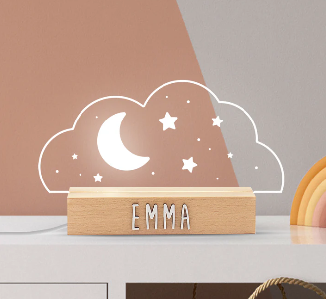 Lampada da tavolo a forma di nuvola, con base in legno naturale e placca in metacrilato trasparente. Include un kit di lettere per personalizzare la base a casa in modo semplice e divertente.