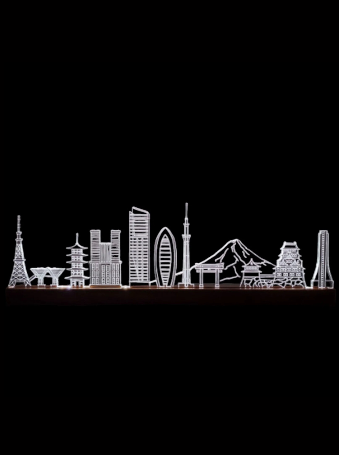 Skylight Tokyo è una lampada decorativa in plexiglas e legno naturale che raffigura lo skyline della città di Tokyo. Una luce calda e d’atmosfera illumina il profilo urbano creando un effetto suggestivo, perfetto per arredare con stile ambienti moderni come camera da letto, soggiorno o ufficio. Ogni pezzo è prodotto artigianalmente in Italia con materiali di alta qualità, unendo design e funzionalità. Ideale come regalo per chi ama l’architettura o il Giappone.